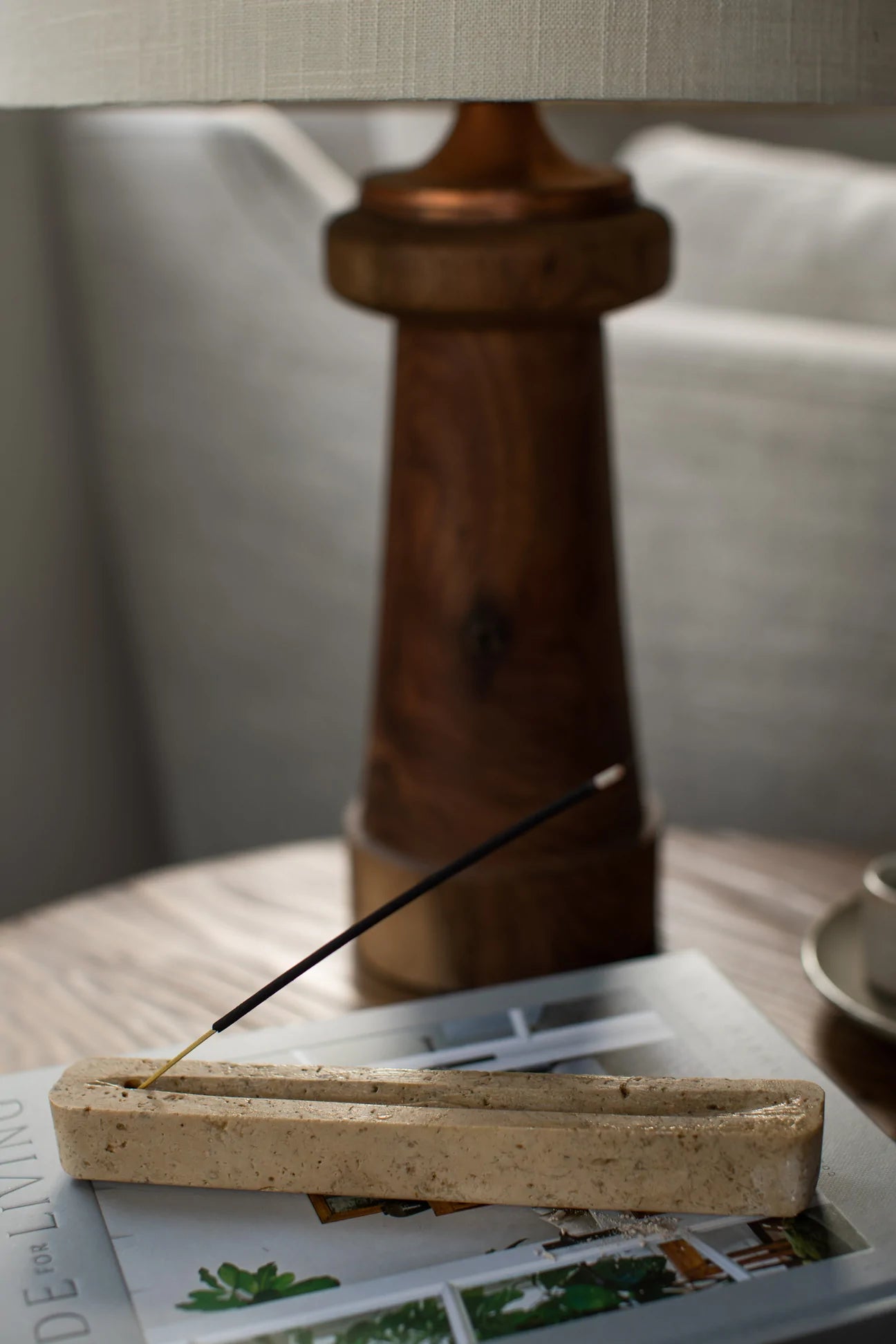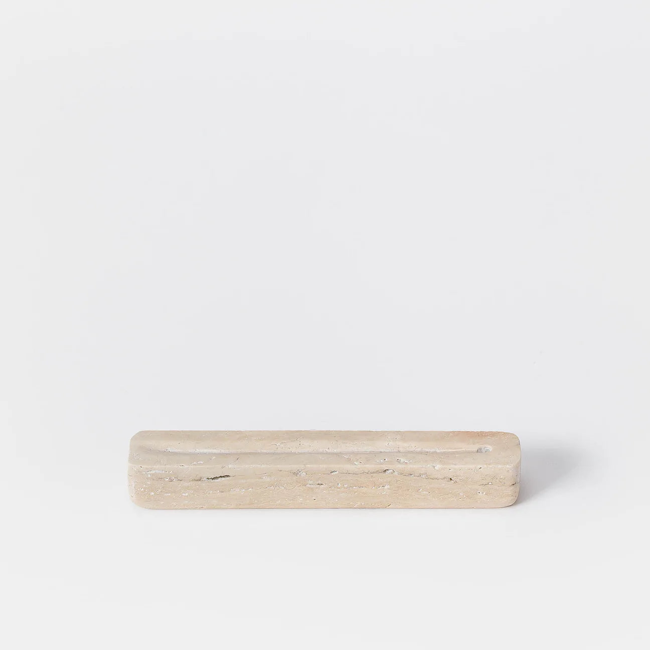 The Travertine Incense Holder is a stylish and useful accessory to add to any shelf or surface. This handcrafted piece is one-of-a-kind, designed and made in the Byron Bay hinterland of Australia. Due to the organic nature of travertine, there will be variations in the stone and texture of each piece.
